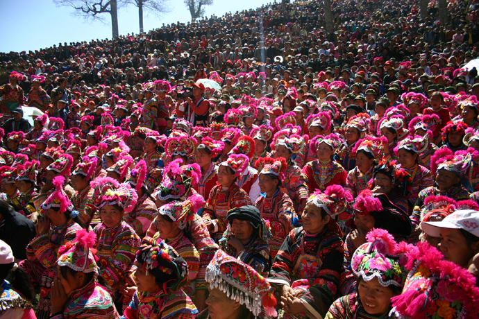 赶会的林间空地很快便熙熙攘攘,笑语喧哗,热闹起来。慢慢地整个山头都挤满了人,真是人山人海,特别是观众里彝 族同胞身穿着自己绣制的彝族服饰,就像是满山的马樱花