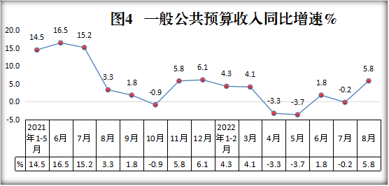 4.1-8月,完成地方财政总收入30041万元,同比增长0.6%;完成一般公共预算收入22882万元,同比增长5.8%;完成一般公共预算支出113595万元,同比增长-13.6%。
