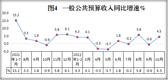 4.1-10月,完成地方财政总收入42999万元,同比增长-0.4%;完成一般公共预算收入33669万元,同比增长4.5%;完成一般公共预算支出146118万元,同比增长2.8%。